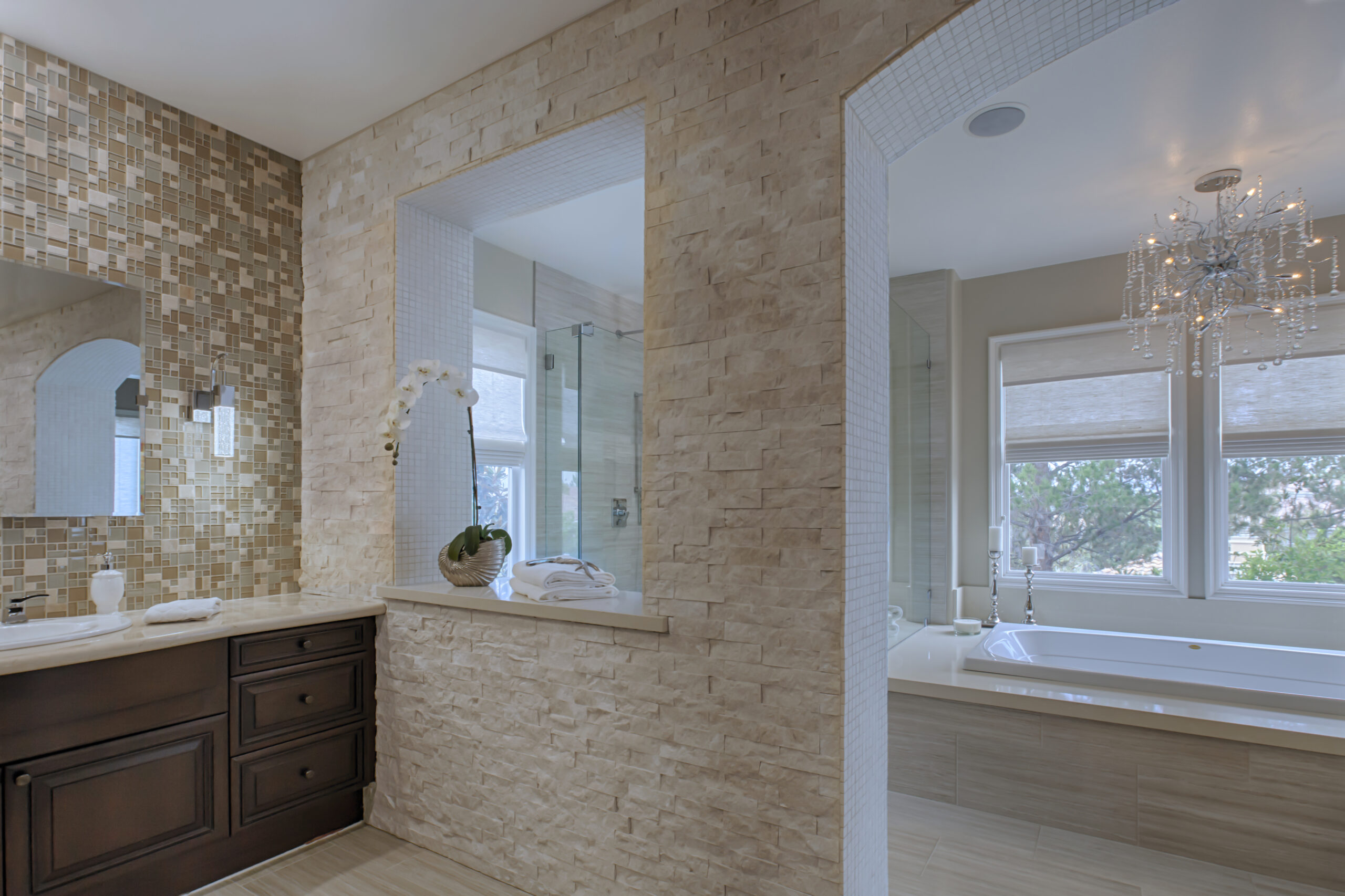 A wonderful couple, embracing their new chapter as empty-nesters, chose to transform their primary bathroom into a modern sanctuary. With a desire to preserve their existing vanities, we crafted a sophisticated update that seamlessly blends texture and elegance. A striking stacked stone feature wall contrasts beautifully with the smooth quartz tub surround, creating a captivating juxtaposition. We retained “her” original marble-top vanity counter, unifying “her” and “his” spaces with shimmering glass mosaic backsplashes that soar dramatically to the ceiling. To distinguish “his” vanity, we introduced a bold, masculine dark quartz countertop, adding definition and balance to the refreshed, harmonious design.